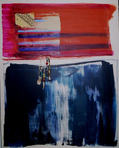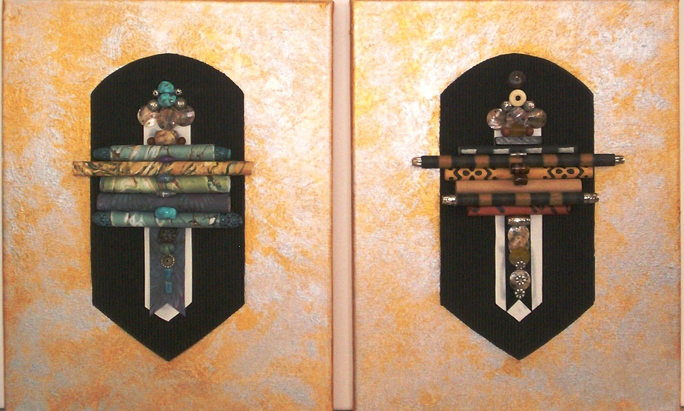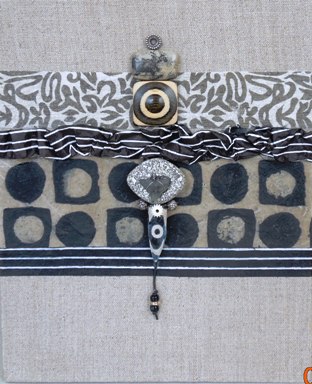 My Ritual paper assemblages begin with handmade scrolls of various exotic papers placed in a design and then heavily embellished with meaningful items that indicate ethnicities, tribes and families – after all, we all belong to a tribe of one kind or another. Even you and me. In these art pieces you will often find small colorful beads constructed by the women of Uganda using recycled paper, carefully cut into elongated triangles, then rolled, glued, lacquered and dried in the sun. (Go to www.BeadforLife.org for more information.) The distinctive chunky black beads with white dots & designs are made by the women of Kenya from sections of found Water Buffalo bone and horn, an animal that is not endangered in Africa. Feathers, shells, ribbons, tassels, leather and dried pine needles and other found objects are often used.