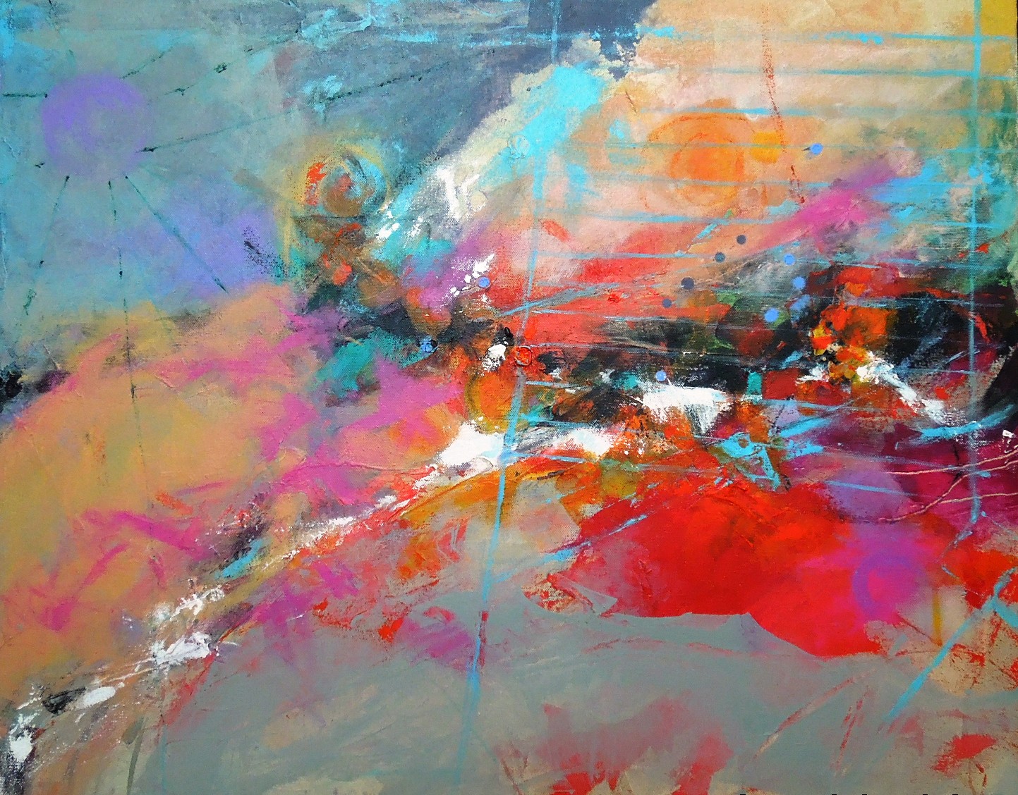 I am here to tell you that abstract art does not have to be profound and serious. Since I am working on this canvas for a solid year, I felt free to be light-hearted and free spirited. I can always get dark and brooding at some future point if I so desire. The changes made in this work session were begun with an eye for balance. The upper left area needed some action to be weighed against all the color and motion in the upper right. What to do, what to do. Circles seem to be a repetitive feature, so I thought I might just capitalize on that. Another sun, in PURPLE, could get attention. Not tooooo much attention, however, or the focal point on the right side would be severely compromised. Where is Homare when I need him? I am going to have to fly by the seat of my own pants this summer.